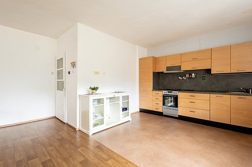 Co vás dál chytne za srdce je francouzské okno s přímým vstupem na prostornou terasu. Ta plynule navazuje na dvorek a zahradu, což vytváří naprosto unikátní propojení, pocit, jako byste bydleli v rodinném domě, ale přitom zůstávali v centru města.