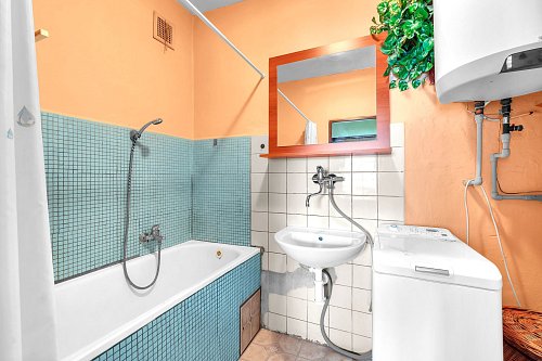 Vytápění bytu je řešeno elektrokotlem s rozvody do radiátorů, ke kotlu je vedená nová elektřina. Ohřev vody elektrickým bojlerem. Okna jsou plastová, podlahy dlažba, PVC a koberce. Byt zůstává částečně zařízený.