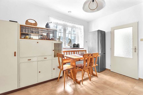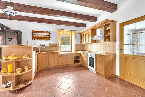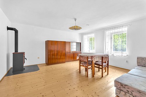 Další jednotka 2+1 má útulnou kuchyň s krásnými kachlovými kamny, dvě prostorné místnosti, novou koupelnu, WC, spíž a místnost se sedačkou a výhledem do zeleně dvora. Nad tím vším se vznáší velká půda, ideální k dalšímu chalupářskému rozletu.