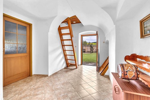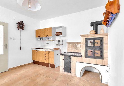 2+1 s útulnou kuchyní, kachlovými kamny, dvěma pokoji (jeden s krbovými kamny), novou koupelnou se sprchovým koutem, samostatným WC, spíží a malou relaxační místností s francouzským oknem a výhledem do zeleně uspořádaného dvorku.