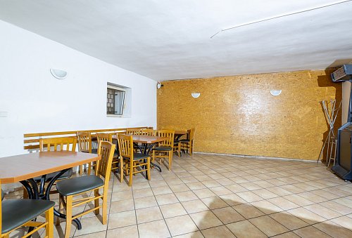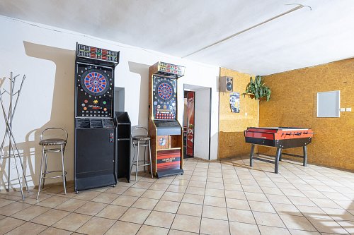 Dispozice zahrnuje hlavní místnost restaurace s výčepem, hernu, sklady, technické zázemí i kompletní sociální zařízení. Klenuté stropy podtrhují charakter místa, zatímco technické zázemí odpovídá provozním potřebám.