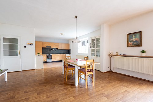 Dominantou je velká kuchyň napojená na obývák, francouzské okno vedoucí na prostornou terasu, ta plynule přechází do dvorku a zahrady. Tento propojený celek dává pocit života „v domě na zemi“. Vše na jednom místě: luxusní prostor, světlo, zeleň i soukromí.