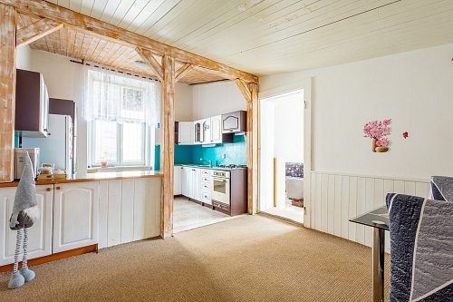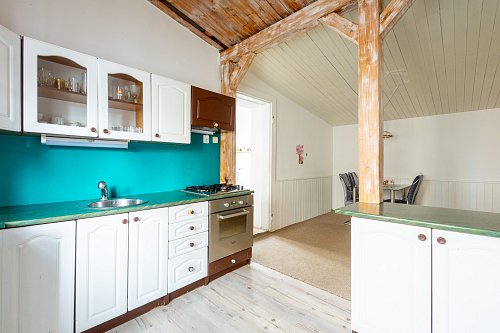 Konstrukčně jde o klasický prostor s trámovými stropy, parketami a plastovými okny. Vytápění i ohřev vody zajišťuje plynový kotel.